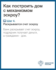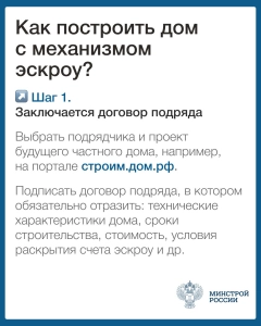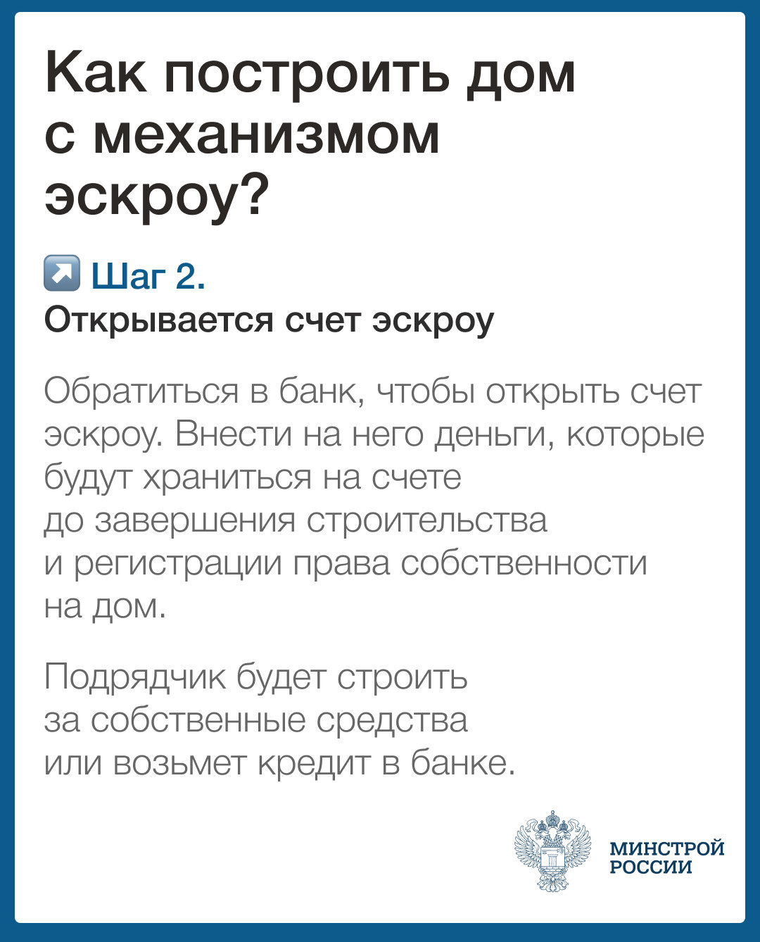 Согласно закону, денежные средства граждан на всем протяжении строительства дома будут размещены на счете эскроу и станут доступны подрядчику только после завершения строительства и регистрации права собственности заказчика на построенный дом. В свою очередь подрядные организации, будут обязаны раскрывать на строим.дом.рф информацию о своей деятельности: об организации, о предлагаемых к строительству проектах домов и о заключенных договорах подряда, включая сведения об их сроках и своевременности исполнения.